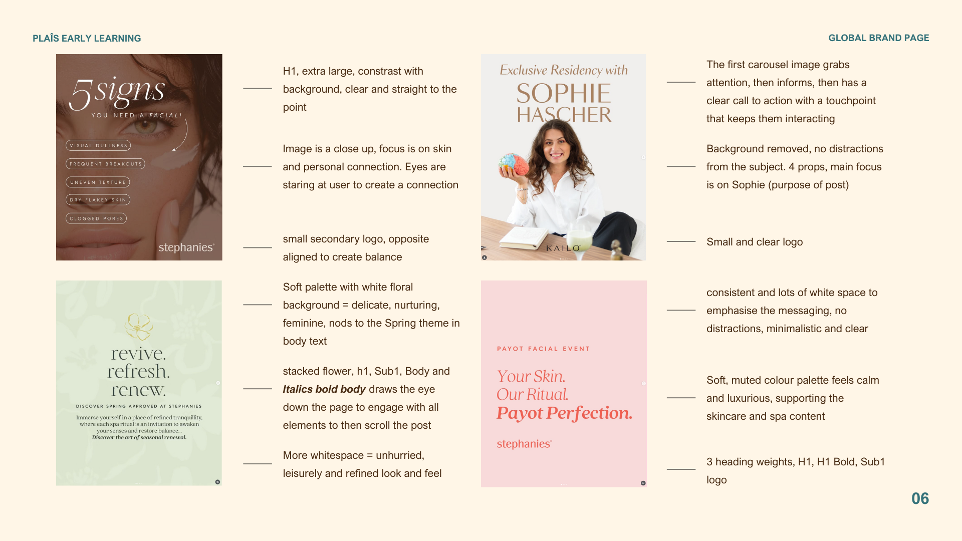 The design approach was informed by research into both childcare competitors and premium brands across health, wellbeing and spa sectors. The visual direction drew from brands that communicate refinement through clean layouts, generous whitespace and purposeful imagery, while applying Plaîs’ brand elements, colour palette and typography from the style guide to create a distinctive and elevated social media presence.